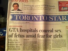 I was reading the paper last week and picked it up on two consecutive days where the headline story was about GTA hospitals that are concealing the sex of baby girls for fear of parents who would want to abort the baby based on its gender. Just reading the headline made me do a double take- not because I was surprised that there are parents out there who want to kill their unborn babies, but because there are hospitals trying to prevent this from happening! Why is this a surprise? Well for starters, for any of us who’ve grown up in the po-mo, everything is relative, make your own morals, no one is right, God does not exist culture, the idea that public hospitals that are part of a healthcare system that has, since before I was born, promoted and encouraged the aborting of babies for any reason at all, should now want to prevent certain people from aborting babies for certain reasons, seems like a paradox. It is a paradox. Bernard Dickens, a professor at the University of Toronto said, “Note the paradox that abortion for no reason- because it’s untimely, unplanned, not wanted- that is acceptable. So then we’ve got the paradox that an abortion for no reason (is ok), but abortion for what seems to be a gendered or sex-based reason is not”. Here is an example of the conflict that inevitably arrises in life without God. The decision was made years ago that it was morally acceptable, not illegal, to kill an unborn child for any reason at all. Now, hospitals are having to address the problem that more and more baby girls of South-Asian parents (where traditionally baby girls are deemed less desirable than baby boys), are being aborted at higher rates than elsewhere in the city. How do you now make it wrong to kill a child in a situation like this, when for such a long time, it has been ok to abort a baby for any reason at all? You can’t. And if you do make it wrong, then you have to go back and rethink the entire position you’ve taken on an issue like abortion, if you are to be consistent in your line of thinking. But then again, consistency is not something that matters much when you make up your own laws in the first place!